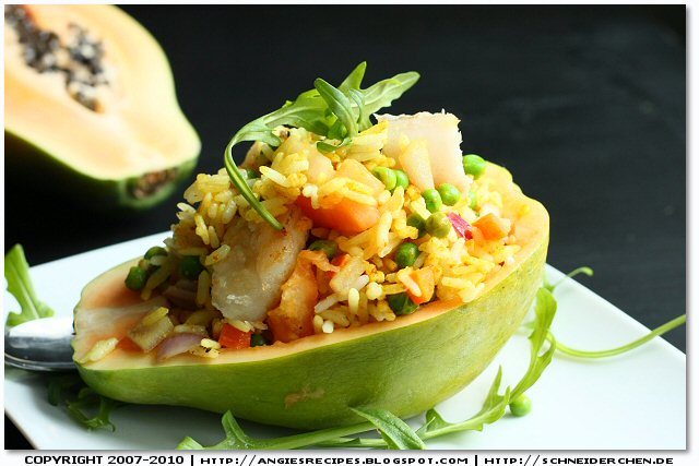 - Add the fish, carrot, and red onion to the rice. Halve the papaya lengthwise and remove the seeds. Scoop out some flesh and add into the rice salad. Fill the papaya shells with rice salad or just serve them in a bowl.